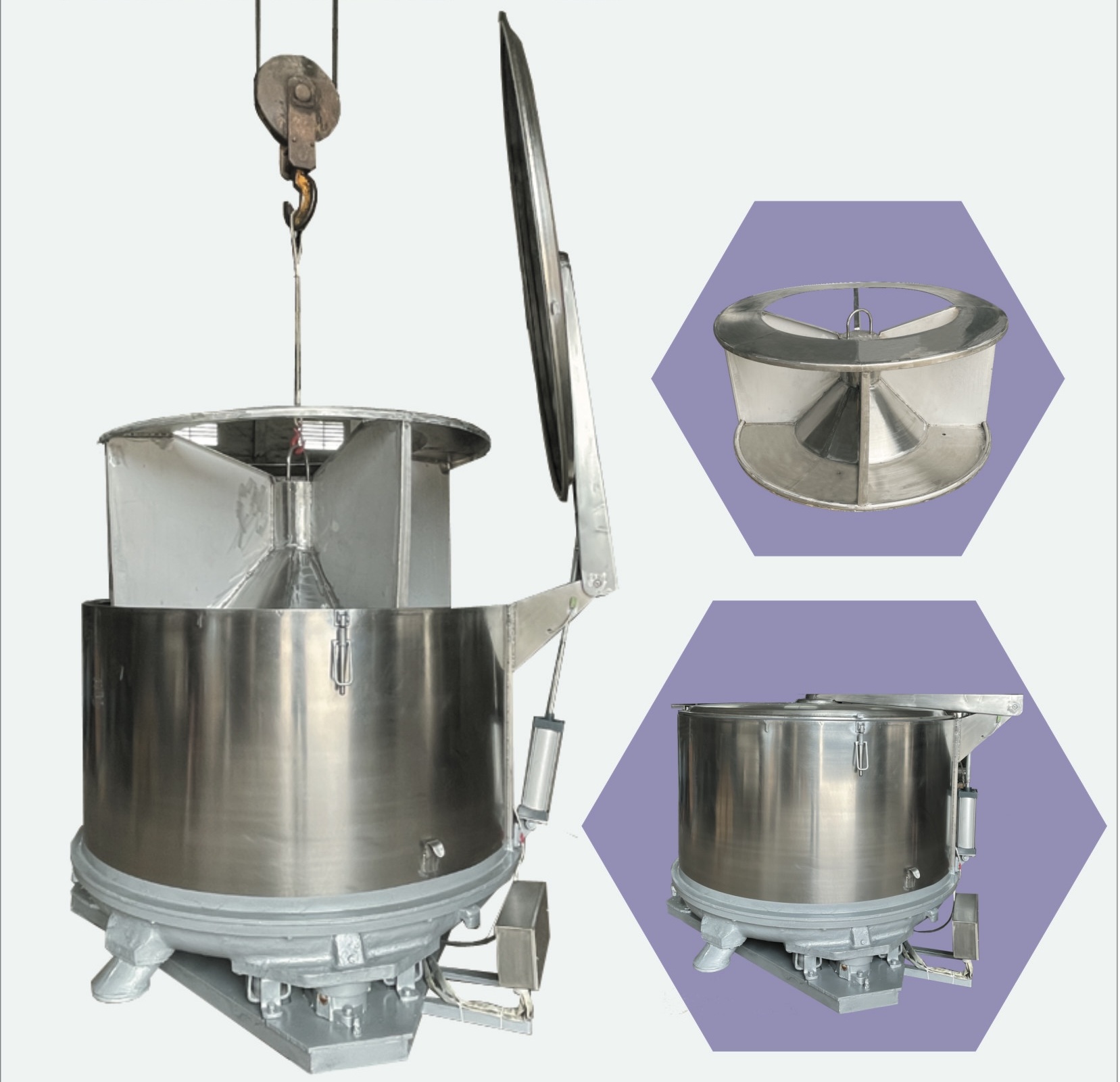 The vertical cylindrical inner cage has no head and is equipped with a sturdy dehydration hanger, facilitating quick and efficient unloading of materials after dehydration.